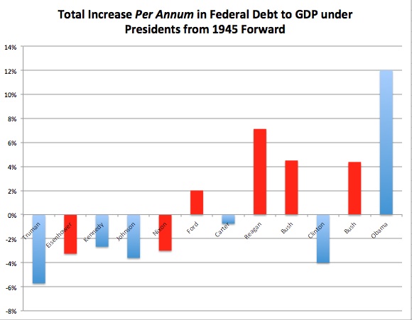 BUT WAIT! you say, this is not fair! Comparing total debt to GDP doesn’t account for the fact that Poppy only served one term before Amercia decided it didn’t like him no more, so he had only half as much time to fuck the country up as his idiot offspring! And you’re right! Here is the annual debt increase to GDP ratio by president (again thanks to Steve Clemons):