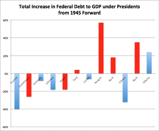 On total increase in debt as a percentage of GDP, W actually beats Reagan but is considerably higher than his Poppy and massively higher than Clinton, who actually decreased the debt relative to GDP. So, um, this is not, exactly, true, what W is saying.