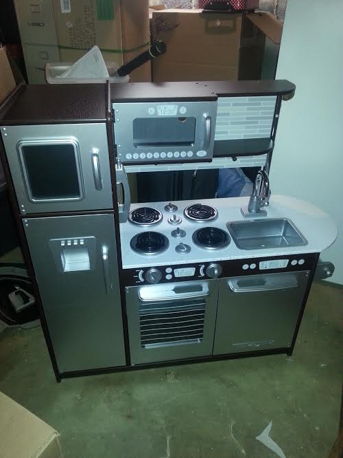 I woke up this morning with a major backache. This was my body’s way of pre-injuring itself in preparation for the thing I’d been putting off all week, assembling my daughter’s main Christmas present. This year she asked for a new play kitchen. She’s had a plastic kitchen-thing since she was so little that I remember being terrified that she might try to pull herself up on it, which if she’d ever done so would have sent child and kitchen tumbling to the floor. But now, what with her being in kindergarten and being a purveyor of only the finest of pretend haute cuisine, she needs something more in keeping with her personal tastes and style.