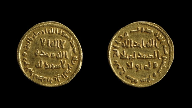 The empire’s most dramatic currency reform came later, in the mid-690s, when ʿAbd al-Malik adopted a new coin that completely tossed out historical precedent and did away with images altogether, replacing them with textual slogans including the shahadah (“There is no god but God, and Muhammad his His messenger”), and a variation of the shahadah that includes the line “and He has no partner.” These became the model for Islamic coinage moving forward. The implication of these radically different coins is that sovereignty, something that coinage has always expressed, lies not with the caliph/emperor, but with God and Islam.