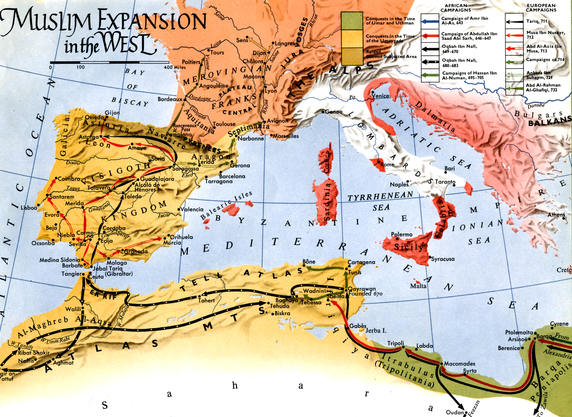 The Strait of Gilbraltar separates the Mediterranean Sea from the Atlantic Ocean. It is named for the Rock of Gibraltar that sits along the northern side of the Strait. The name “Gibraltar” comes from the Arabic phrase Jabal Tariq, or “Tariq’s mountain,” and is named for Tariq b. Ziyad (d. 720), the (probably) Berber commander of the first Islamic military expedition to cross the Strait from North Africa and enter Iberia. Gibraltar’s twin on the southern side of the Strait is called Jebel Musa, named for Musa b. Nusayr (d. 716), the Arab governor of North Africa who sent Tariq into Iberia and later joined him in conquering it. It should not be confused with the other Jabal Musa, Mount Sinai, whose name should be clear (“Musa” is the Arabic form of “Moses”). So just by looking at a map of the area you can learn about the two key figures in the story we’re about to tell, but before we really begin to tell it I think we need to talk about the Arab conquest of North Africa and the incorporation of a new ethnic group into the Caliphate: Berbers.