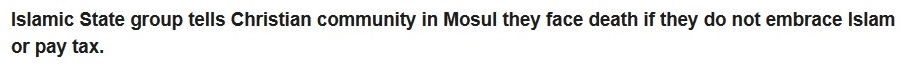 Aw, come on Al Jazeera. Is it not awful enough that some crazed wanna-be emperor is talking about reimposing a poll tax on people who don’t practice the Right Faith in the year two thousand and fucking fourteen? Do we have to sensationalize the story on top of that? Because “Convert, die, or pay an extra tax” is not really the same as “Convert or die,” you know?
