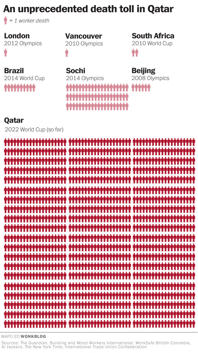 Yeah, that’s a lot of unnecessary deaths, and it’s a real injustice that FIFA head Sepp Blatter can’t be charged with manslaughter (at a minimum) for each one of them. It’s still far less than half of the 4000 workers it’s estimated will die in order to ensure that the Qataris can put on a real fancy soccer tournament, though, so pulling the plug on the whole thing, right now, would still be best for everybody.