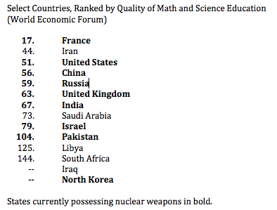If placing 73rd is disqualifying for developing a nuclear weapons program, explain Israel. And how the heck did Pakistan manage to build a bomb without blowing itself up?
