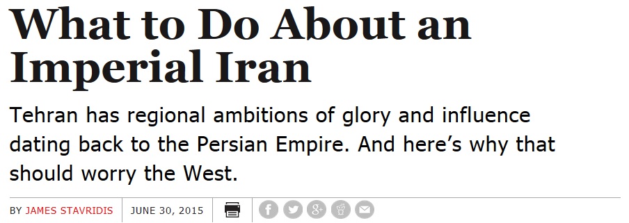 Also, what country, given the choice, wouldn’t “seek regional dominance, a significant global level of influence, and the development of a power center that is…a force in its own right”? History, which Adm. Stavridis likes so much, tells us that even the Vatican likes to throw its weight around whenever possible. And why, apart from some outdated-by-at-least-a-full-century Euro-centric view of The Way Things Ought To Be, should Iran worry about being “a bridge between East and West (note the use of the capital letters, indicating that ‘East’ and ‘West’ are two fixed and entirely separate entities; that’s how you know you’re doing Orientalism right)” if it’s not in Iran’s national interest?