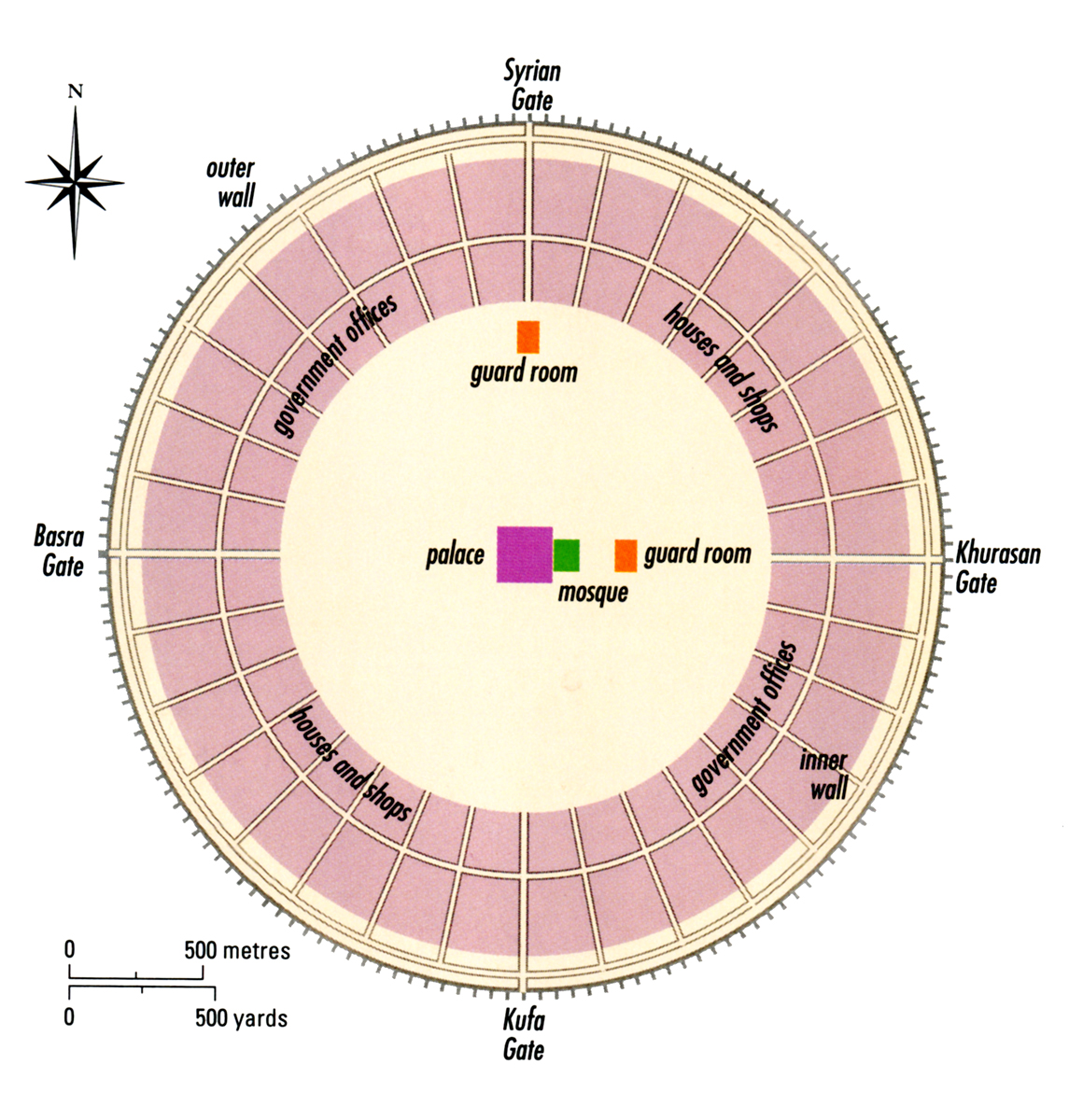Baghdad was intended as a replacement for a couple of much older cities. It replaced the old Sasanian capital, Ctesiphon, which was founded in the second century BCE and was only about 20 miles southeast of Baghdad, as the major city of the “Persian” part of the Caliphate (the site was also close to the more ancient city of Babylon), and it replaced Damascus, which has been an important city since the second millennium BCE and has had people living on its site at least as far back as the 6000s BCE, as the Caliphal capital. It was meant to symbolize a break with the Umayyad dynasty as well as a way to move the empire’s center of power closer to the Abbasids’ base of support in eastern Iran, without moving it so far east that it might become impossible to control Syria and Egypt. Al-Mansur situated his new capital at a spot where the Tigris and Euphrates flow close together, which put it in a great position for trade and communication. It was built as a circular city, in keeping with earlier Sasanian models, with rings of housing and commercial spaces inside the wall, surrounding a central area that contained the palace, the city’s communal mosque, and quarters for soldiers.