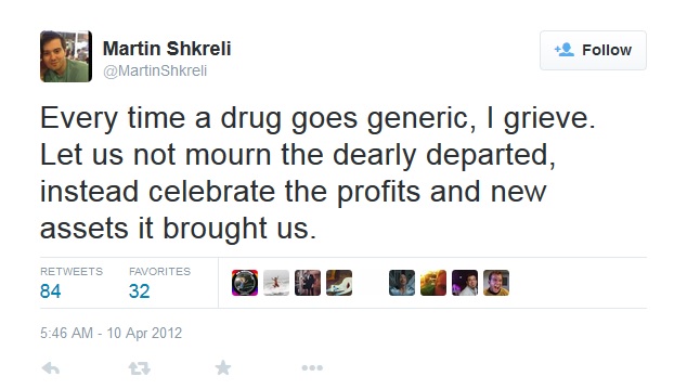 The drug is Daraprim, which Shkreli’s Turing Pharmaceuticals bought a few weeks ago from Impax Laboratories. As Healio and USA Today reported in recent days, Turing immediately hiked the price from $13.50 per pill to $750.