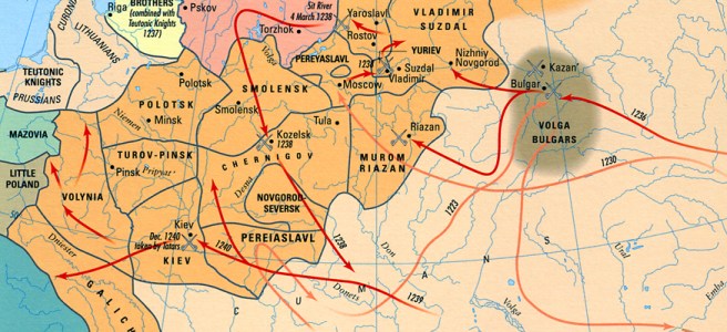 Historians often cite the 1240 Mongol sack of Kyiv as the final end of the Kyivan Rus’ federation, but as with most things there’s more to the collapse of the Rus’ than one solitary event. For nearly two centuries prior to 1240, the balance of power in the Rus’ federation had been shifting gradually away from Kyiv and toward its constituent principalities, who fought each other for supremacy almost as often as they fought any external enemies in self-defense. The federation’s ruling Rurik Dynasty began to fragment, as uncles contested with nephews for succession and local princes refused to be governed by the Grand Prince of Kyiv. The federation was the kind of political entity whose cohesion depended in large part on the strength of any given Grand Prince, and so when a series of weak (or weakened by infighting) monarchs came to the throne one after another, decentralization was the inevitable result.