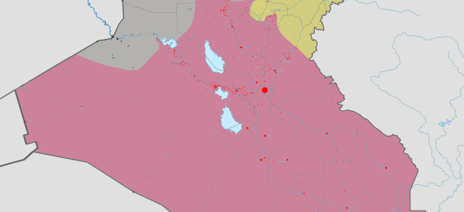 You can’t see the three towns on the map below, but if you follow the Euphrates River in from Syria you can see where it flows through ISIS-controlled territory (gray)–that’s where this next phase of the war will be focused: